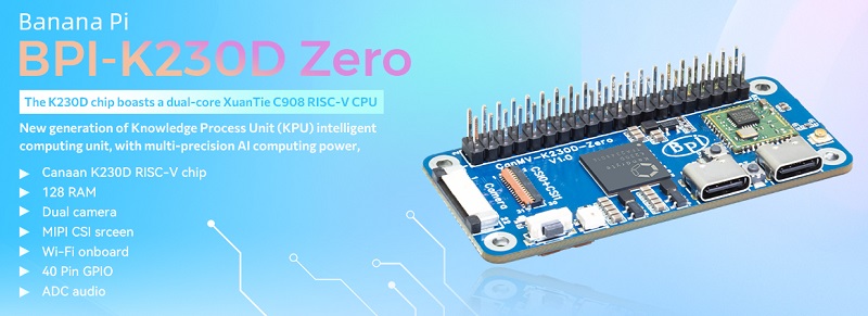 BPI-CanMV-K230D Zero开发板采用的是嘉楠科技Kendryte®系列AIoT芯片中的最新一代SoC芯片K230D。该芯片采用全新的多异构单元加速计算架构,集成了2个RISC-V高能效计算核心,内置新一代KPU(Knowledge Process Unit)智能计算单元,具备多精度AI算力,广泛支持通用的AI计算框架,部分典型网络的利用率超过了70%。
