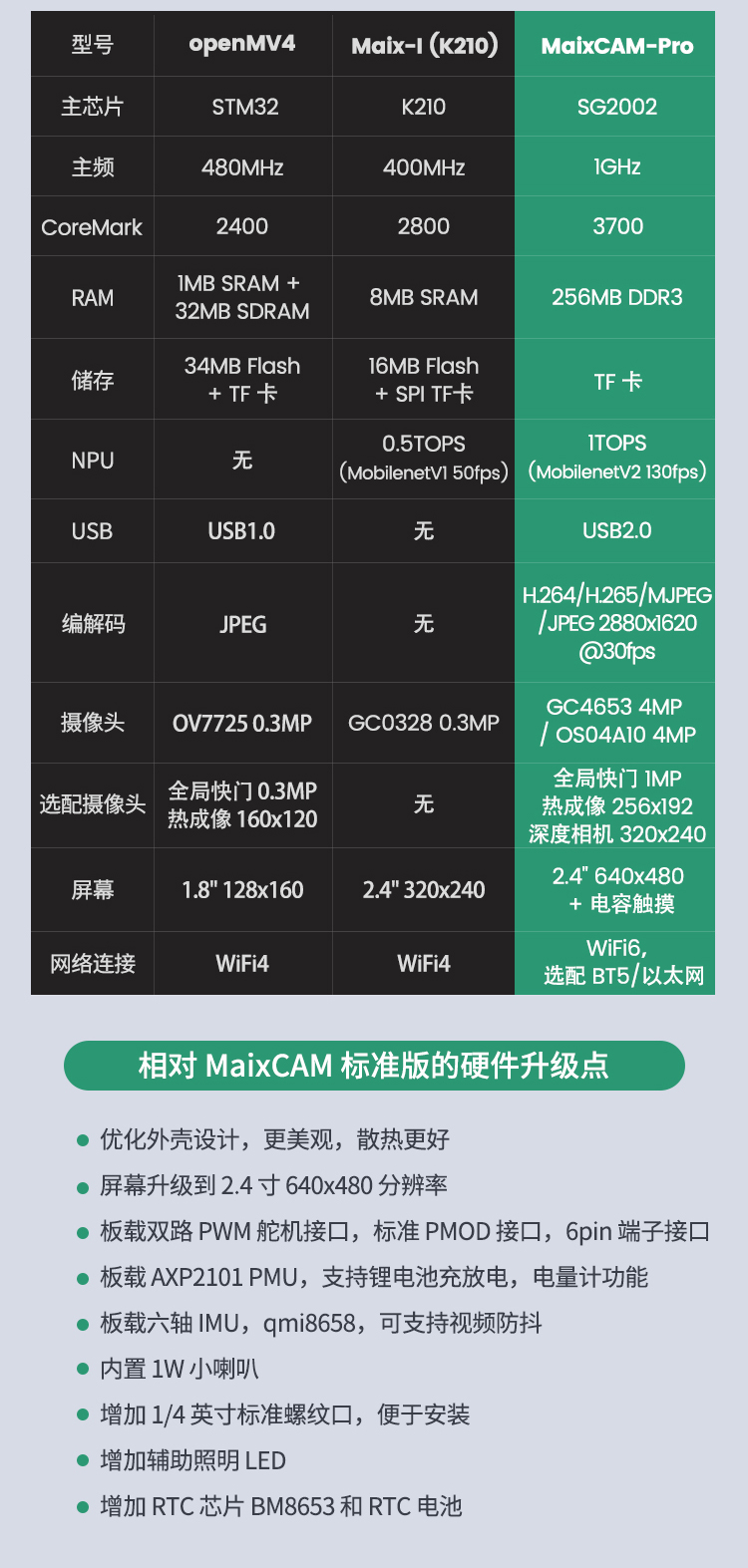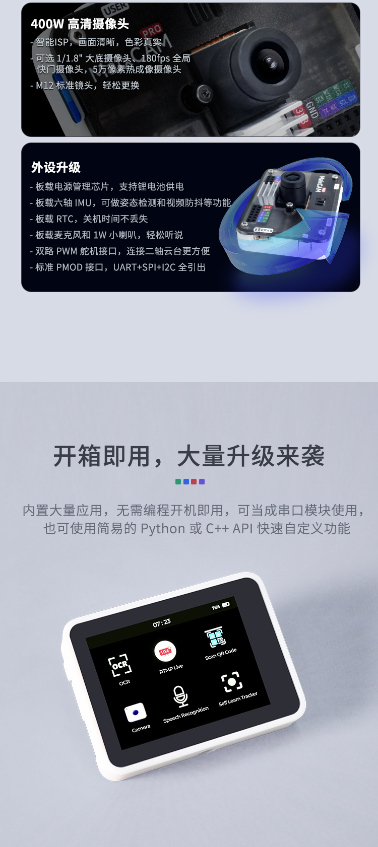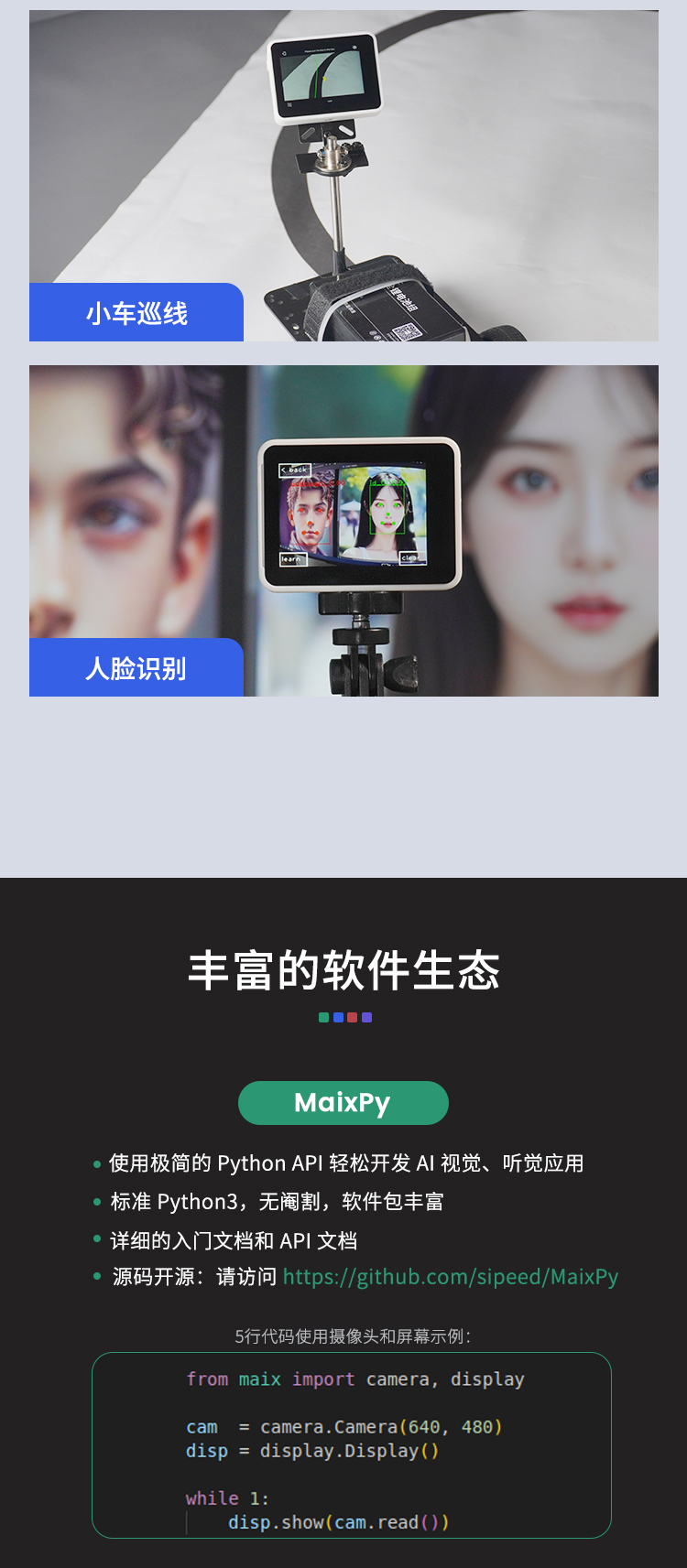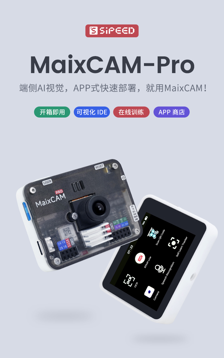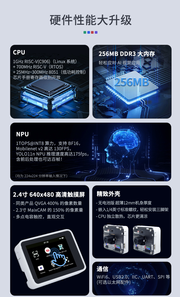 基于SG2002的RISCV AI视觉摄像头模块,可视化触摸屏UI操作,内置十余款APP,支持MaixPy+MaixCDK开发环境,支持自研MaixVision 专业视觉IDE,支持MaixHub 在线训练平台。SoC: SG2002(1GHz C906+700MHz C906 + 256MB DDR + 1TOPS NPU),2.3寸552x368 MIPI触摸屏,标配 1/3” GC4653 4MP摄像头,板载WIFI6+BT5模块,6轴 IMU,1W小喇叭,RTC时钟,对外引出两路舵机接口,PMOD接口,Grove接口。