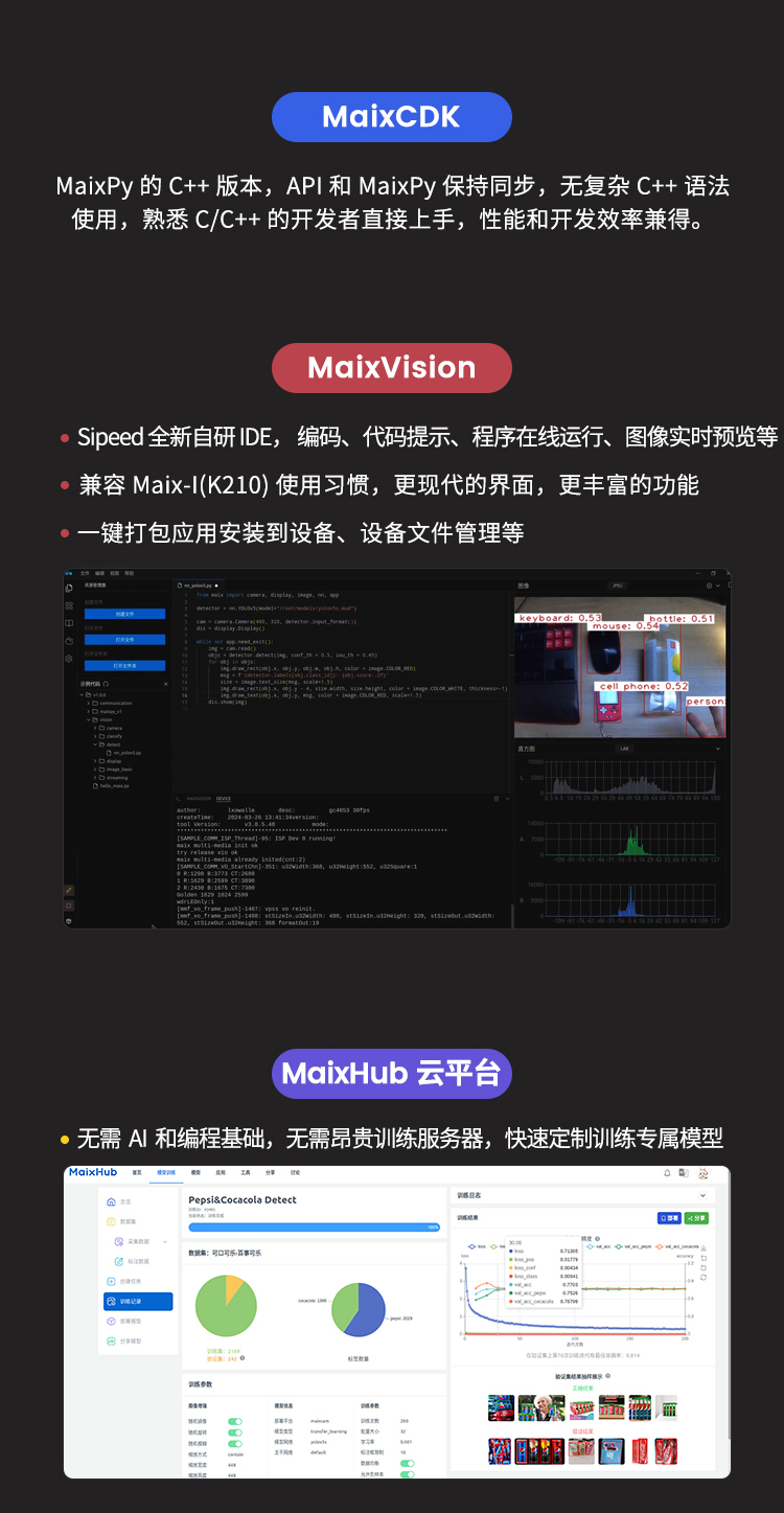 Sipeed矽速科技专注于AIoT边缘智能软硬件服务,提供适用于不同应用场景的标准模块、AI算法及软硬件定制,加速物联网开发者开发速度。